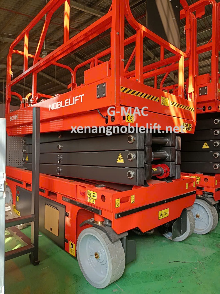 Thang nâng người cắt kéo điện Noblelift (Electric Scissor Lift): Dùng pin hoặc điện lưới để vận hành. Thích hợp cho môi trường trong nhà hoặc không gian kín vì không tạo khí thải, hoạt động êm ái.