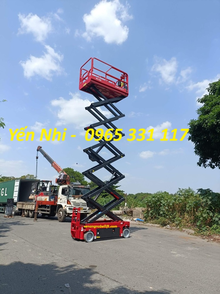 Thang nâng người cắt kéo (Scissor Lift) Đây là loại phổ biến nhất, có hình dáng như cây kéo xếp chồng. Hoạt động theo nguyên lý thủy lực, thang nâng dạng cắt kéo giúp nâng bệ làm việc theo phương thẳng đứng, thích hợp cho công việc cần độ ổn định cao như sơn tường, lắp trần, vệ sinh kính...